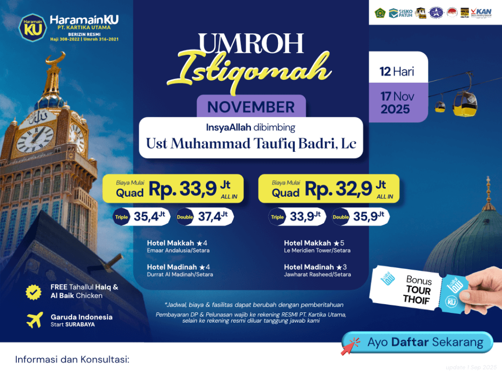 KETENTUAN : Jadwal, Biaya, dan Fasilitas dapan berubah sewaktu-waktu mengikuti kebijakan pemerintah KSA dan Indonesia